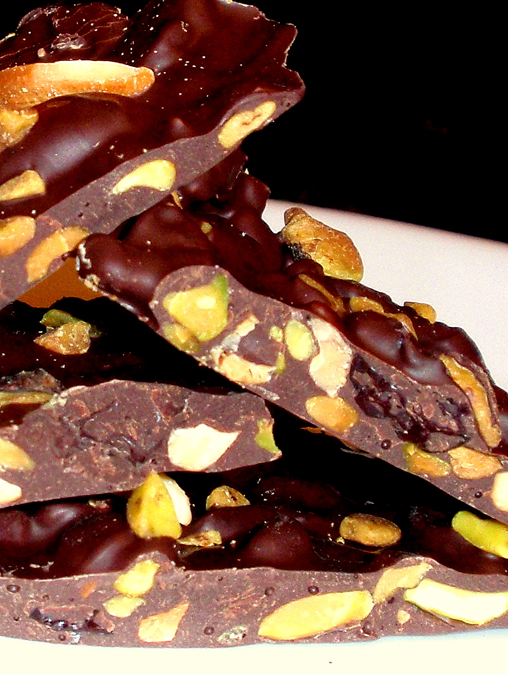 Pour the chocolate onto the pan, covering the nuts and cherries in an even layer. Add remaining nuts to the top of chocolate and press them into the chocolate.